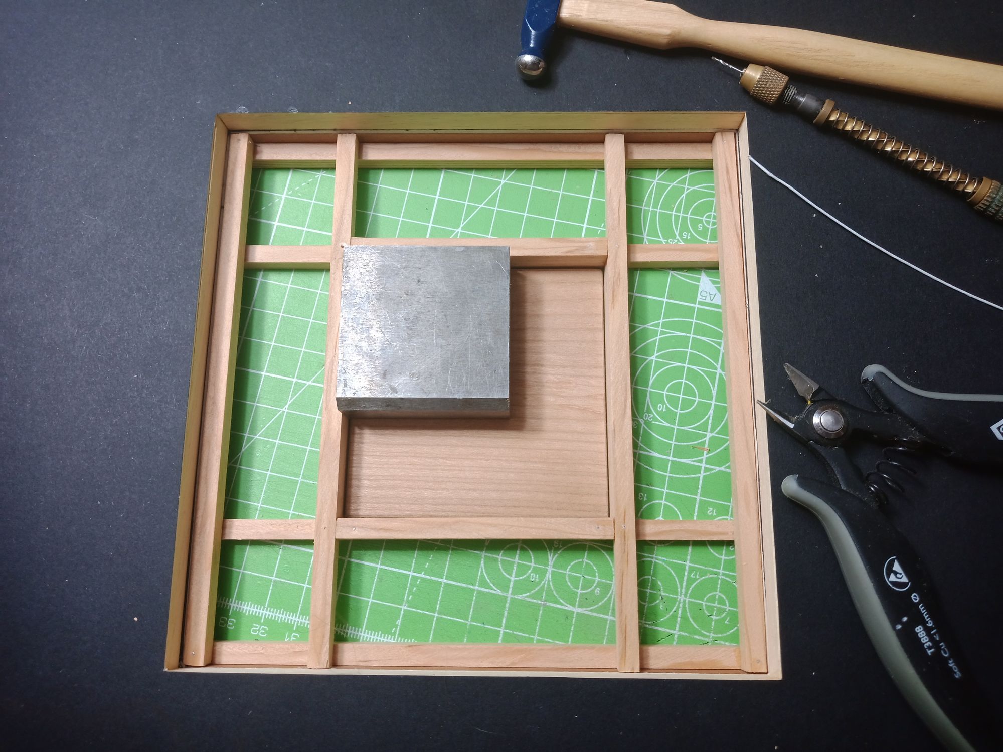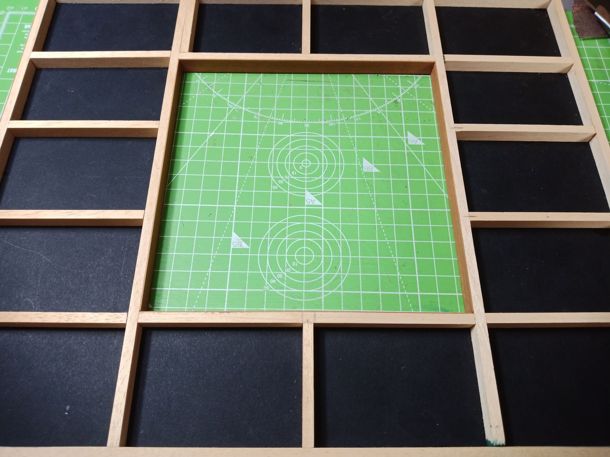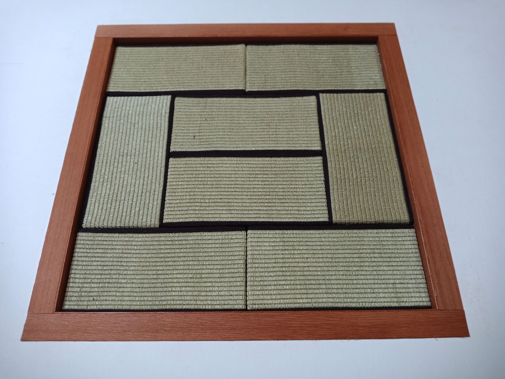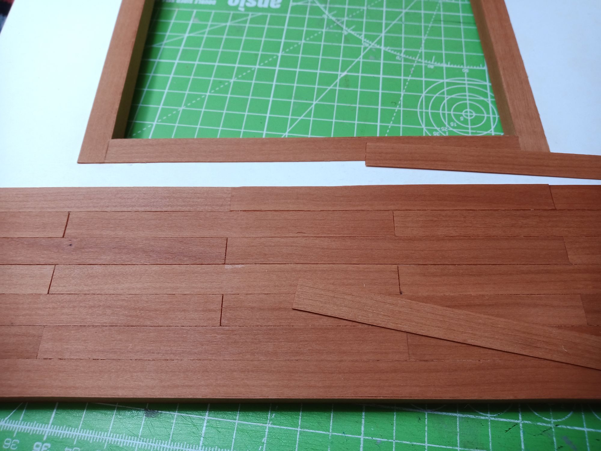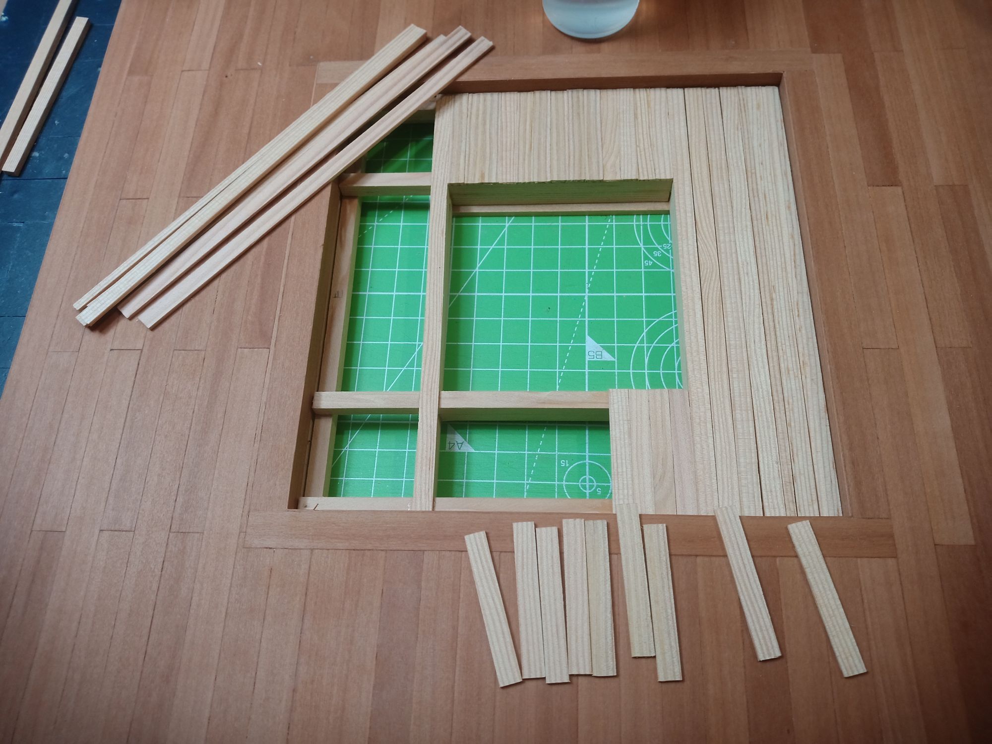 First step is to group the tatami mats and measure them and make a frame around them. Cut a hole in the matboard the same size as the frame's inner measurements and start gluing in the wood strips and the frame. This time I use swiss pear wood veneer for the flooring and “structural” tatami frame. I love the look of natural wood and also hate painting and lacquering, so the perfect finish for me is sanding and hemp oil and a bit more sanding, and after a month or so a buff with wood balsam.