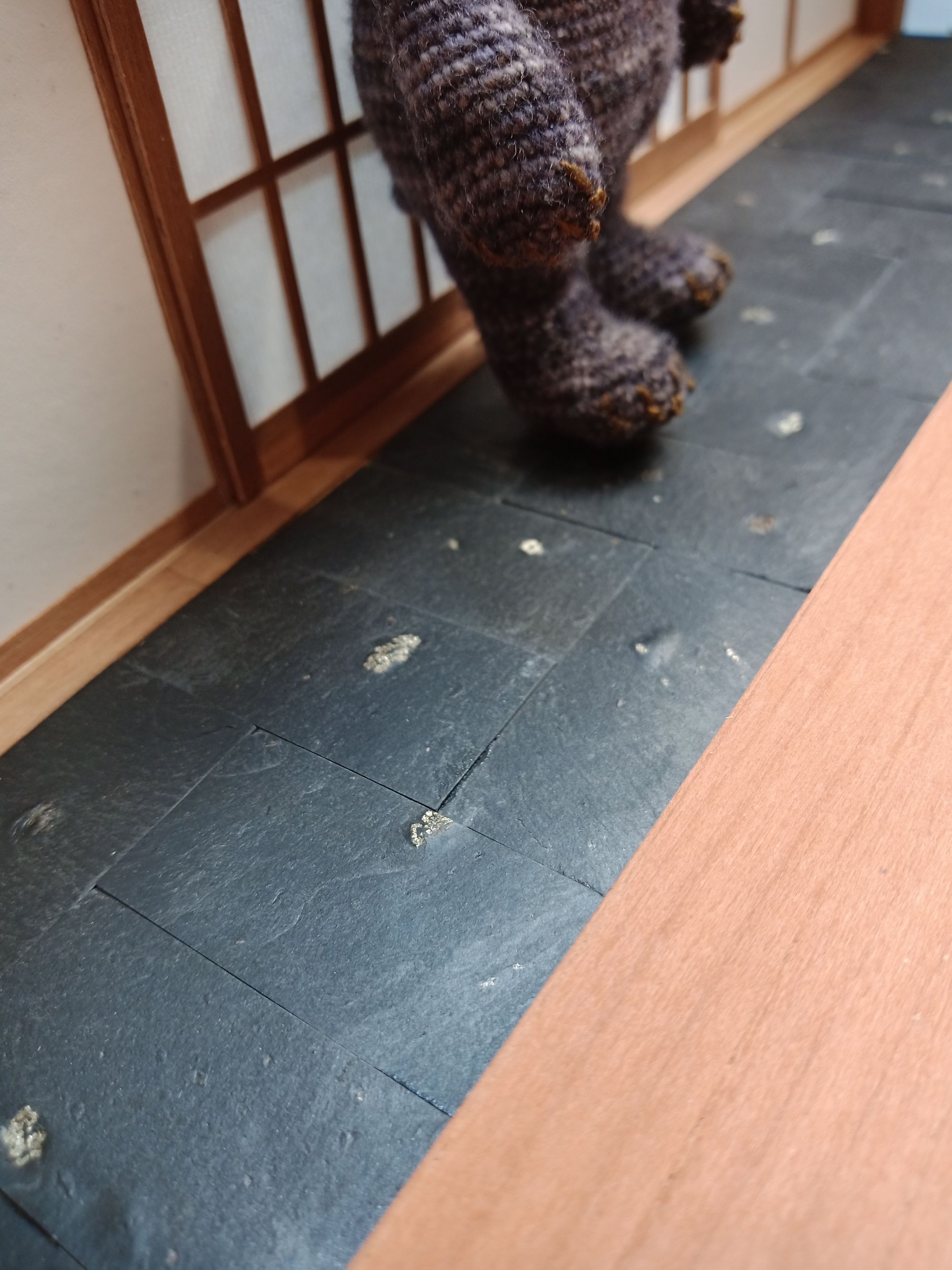 The entrance was easy, a few years back I bought a little bag of real slate roof tiles, they were in the bargain bin because of the pyrite inclusions and although I don't have the right tools to cut them straight, the slate is soft enough so that I could file down the tiny bit of excess on the one piece I needed to break in two.